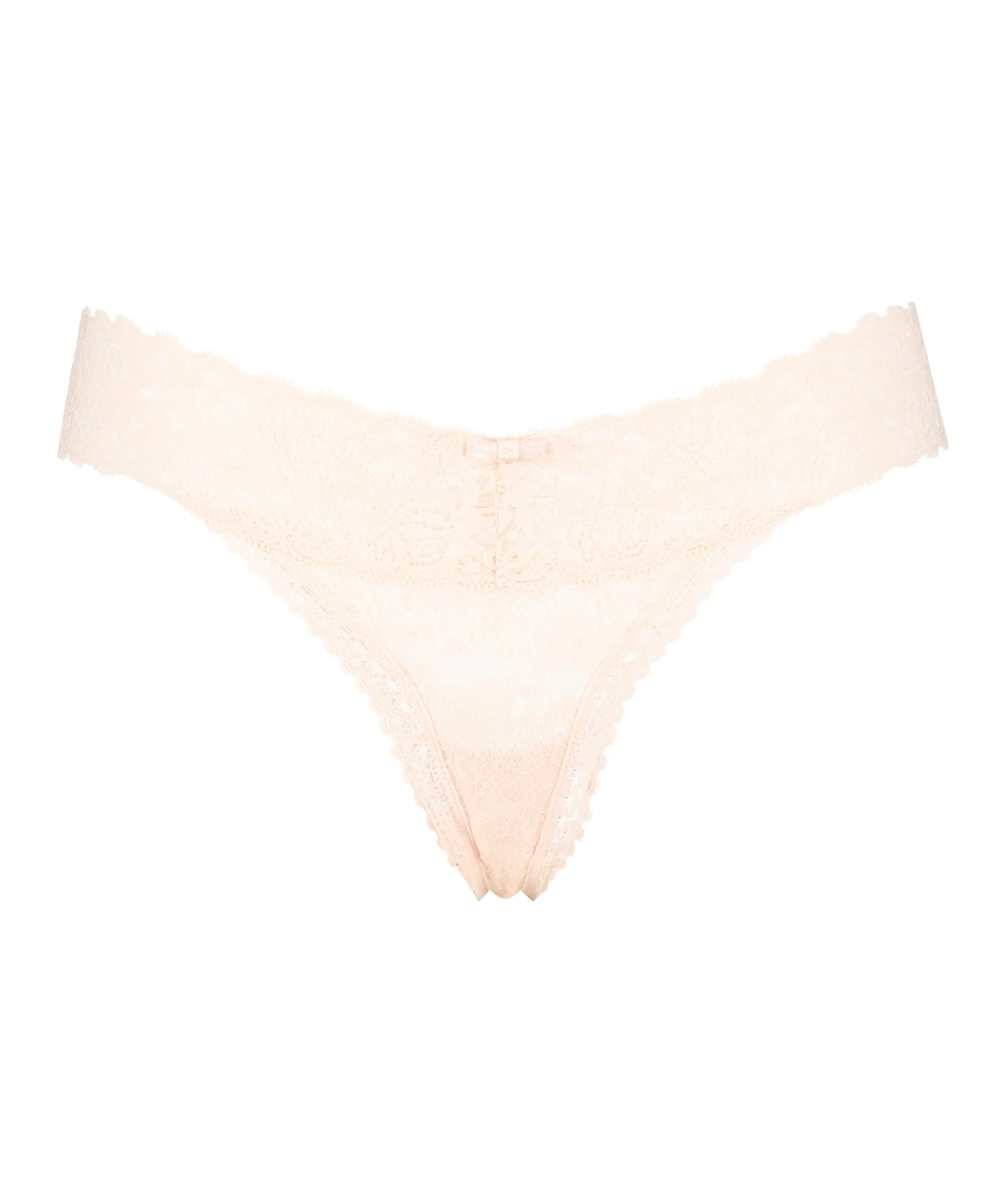 Join the lace obsession! Dieser besonders niedriggeschnittene V-String ist aus Spitze und mit einer kleinen Schleife verziert.