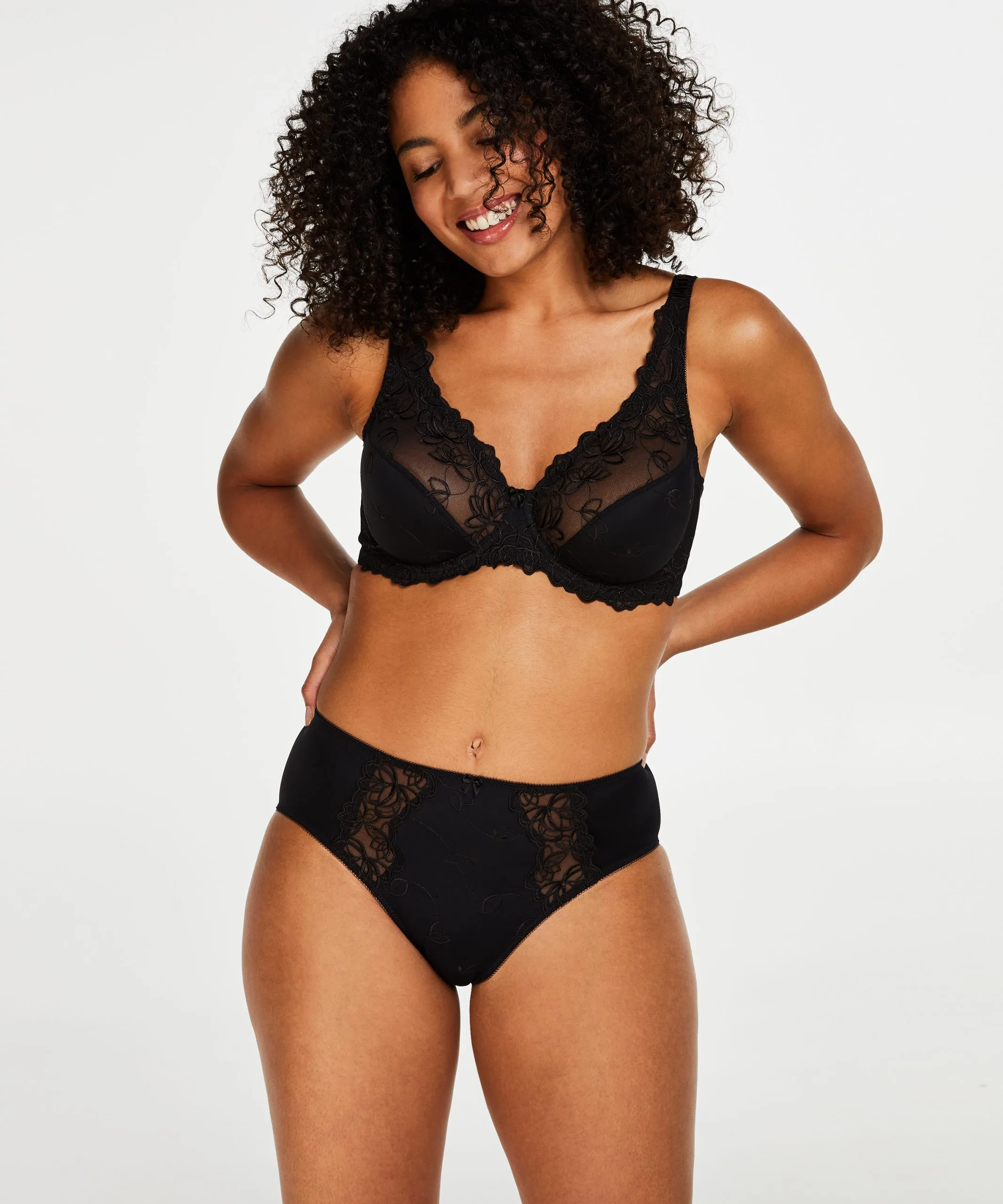 Dieser hochgeschnittene Slip ist aus einem geschmeidig fallenden Material, das für eine angenehme Passform sorgt. Der Slip ist vorne mit Blumenstickerei und einer Schleife verziert.